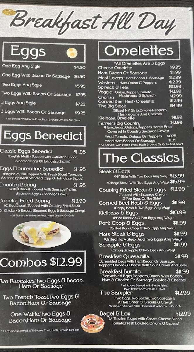 Rise & Grind Cafe offers a straightforward and comforting menu that captures the spirit of a casual breakfast spot with a modern twist. Guests can expect a variety of hearty dishes perfect for starting the day or enjoying a relaxed brunch, featuring classics like eggs Benedict, flavorful omelettes, and comforting combos such as pancakes paired with eggs and sausage.